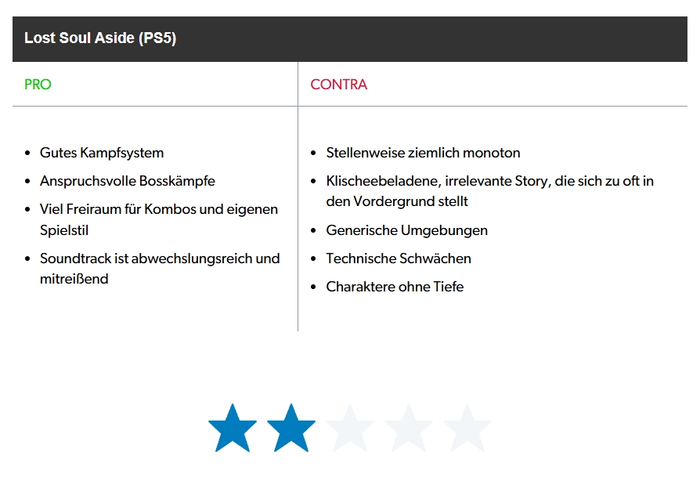 Eurogamer Germany为本作给出了40分:《失落之魂》是一款充满矛盾的游戏。战斗系统令人兴奋,但剧情却非常乏味。一方面是其中精心设计的BOSS战,另一方面却充斥着像占位符一样的元素。