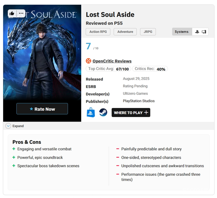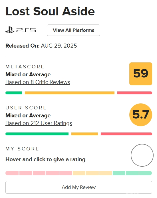 《失落之魂》目前媒体评分已解禁,截止本文发出时,游戏的PS5版Metacritic均分为59分,共收录9家媒体评价,最高分80分由Gamersky(游民星空)给出。用户评分为5.7分,共收录212位用户评价。